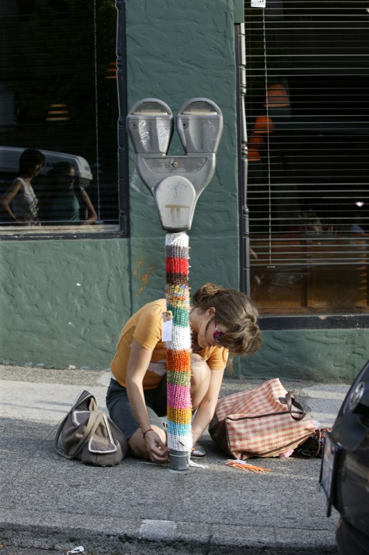 Sayeg and her group Knitta Please! are hardcore street artists. they've got work everywhere from Texas to The Great Wall of China